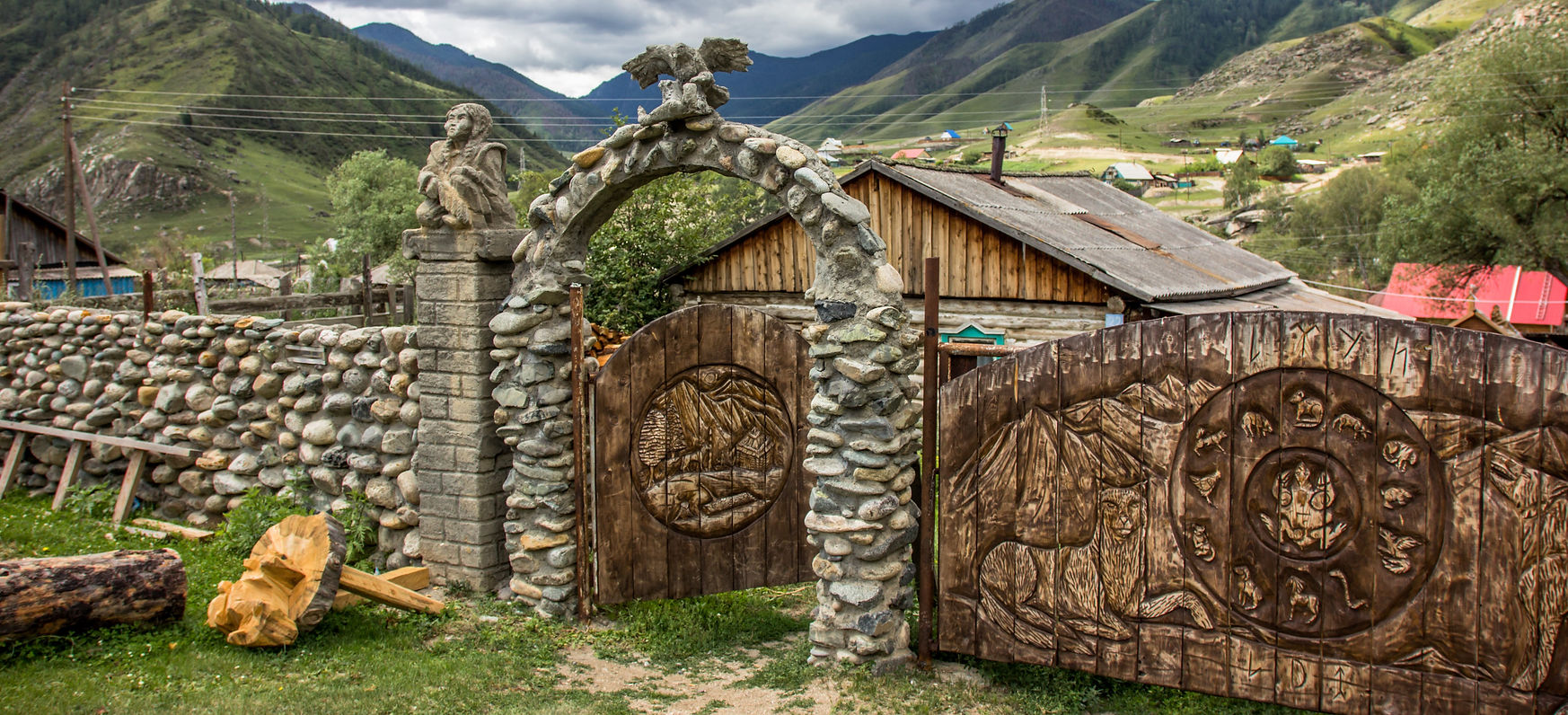 Ворота дома мастера по дереву и камню С.Урчимаева в с.Купчегень